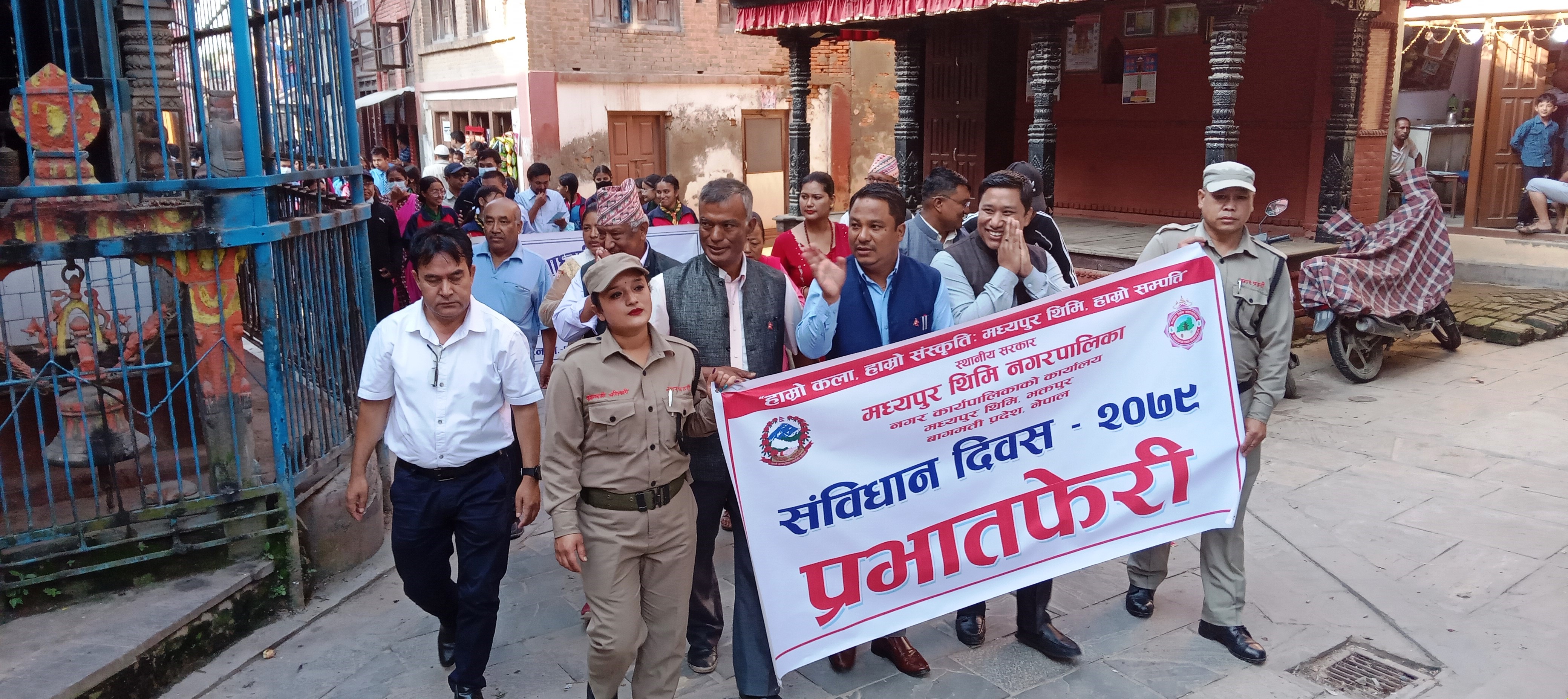 आज सोमवार संविधान दिवसको अवसरमा मध्यपुर थिमि नगरपालिकाले प्रवचन कार्यक्रममा आयोजना गरेको छ । विभिन्न राजनीतिक दलका नेता, कानुनविद् एवम् जनप्रतिनिधिहरुले संविधानको अक्षरस पालना गरी नुपर्नेमा जोड दिएका छन । कार्यक्रममा संघीय लोकतान्त्रिक गणतन्त्रलाई संस्थागत गर्दै लैजान पनि सबैले संविधानको अक्षरस पालना गर्नुपर्ने औल्याए । संविधान दिवसको अवसरमा मध्यपुर थिमि नगरपालिकाले आयोजना गरेको प्रवचन कार्यक्रममा सहभागीहरुले स्थानीय तहमा संविधानको मर्म र भावना अनुरुप कार्य गर्न सके मात्र नागरिकले घर आँगनमा नै सरकारको अनुभुती गर्न सकिने समेत बताएका छन् ।
