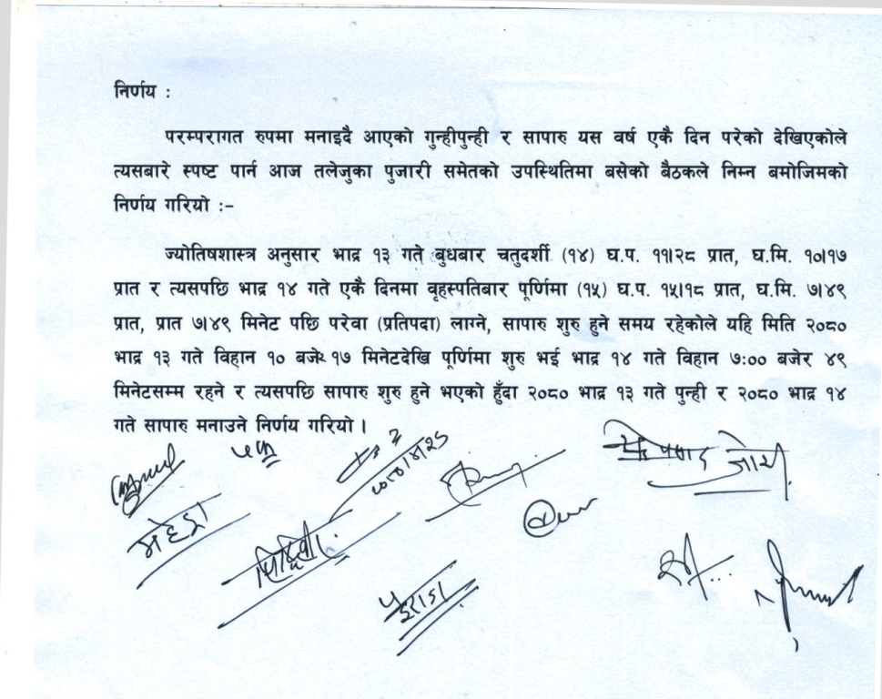 भक्तपुर नगरपालिकाका प्रमुख सुनिल प्रजापतिको अध्यक्षतामा सरोकारवालाहरुको उपस्थितिमा बसेको बैठकले ज्योतिषशास्त्र अनुसार भाद्र १३ गते बुधबार चतुदर्शी (१४) घ.प. ११।२८ प्रात, घ.मि. १०।१७ प्रात र त्यसपछि भाद्र १४ गते एकै दिनमा वृहस्पतिबार पूर्णिमा (१५) घ.प. १५।१८ प्रात, घ.मि. ७।४९ प्रात, प्रात ७।४९ मिनेट पछि परेवा (प्रतिपदा) लाग्ने, सापारु शुरु हुने समय रहेकोले यहि मिति २०८० भाद्र १३ गते विहान १० बजे १७ मिनेटदेखि पूर्णिमा शुरु भई भाद्र १४ गते विहान ७ः०० बजेर ४९ मिनेटसम्म रहने र त्यसपछि सापारु शुरु हुने भएको हुँदा २०८० भाद्र १३ गते पुन्ही र २०८० भाद्र १४ गते सापारु मनाउने निर्णय गरेको हो । बैठकमा शिक्षा, संस्कृति तथा स्वास्थ्य समितिका सदस्यहरु उपप्रमुख रजनी जोशी, वडाध्यक्ष योगेन्द्रमान बिजुक्छेँ, कार्यपालिका सदस्य कृष्णप्यारी भुजु, प्रमुख प्रशासकीय अधिकृत विजयकुमार शर्मा र तलेजुका पुजारीहरु प्रजेशराज राजोपाध्याय, नरेन्द्रप्रसाद जोशी, महेन्द्र कर्माचार्य, पदमलोचन कर्माचार्य, सिद्धिवीर कर्माचार्य र केदारप्रसाद जोशी समेतको उपस्थिति रहेको थियो ।