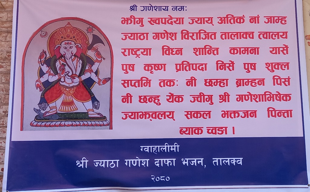 भक्तपुर नगरपालिका वडा नं. ४ तालाक्व (कुम्हःत्व) स्थित ज्याठा गणेश मन्दिर प्रङ्गणमा २१ ब्राम्हणद्धारा २१ दिने रुद्रिपाठ संचालन भईरहेको छ । नेपाल मै पहिलो दावी गरिएको उक्त रुद्रि अहिले सम्म कहीँ पनि नगरिएको बताउँनु भयो । सास्त्रमा उलेख गरिएको दावी गर्दै रुद्रिपाठका मुल संयोजक सरोजन राजउपाध्याले पहिलो पटक ज्याठा गणेशमा शुरु गरिएको बताउँनुभयो ।