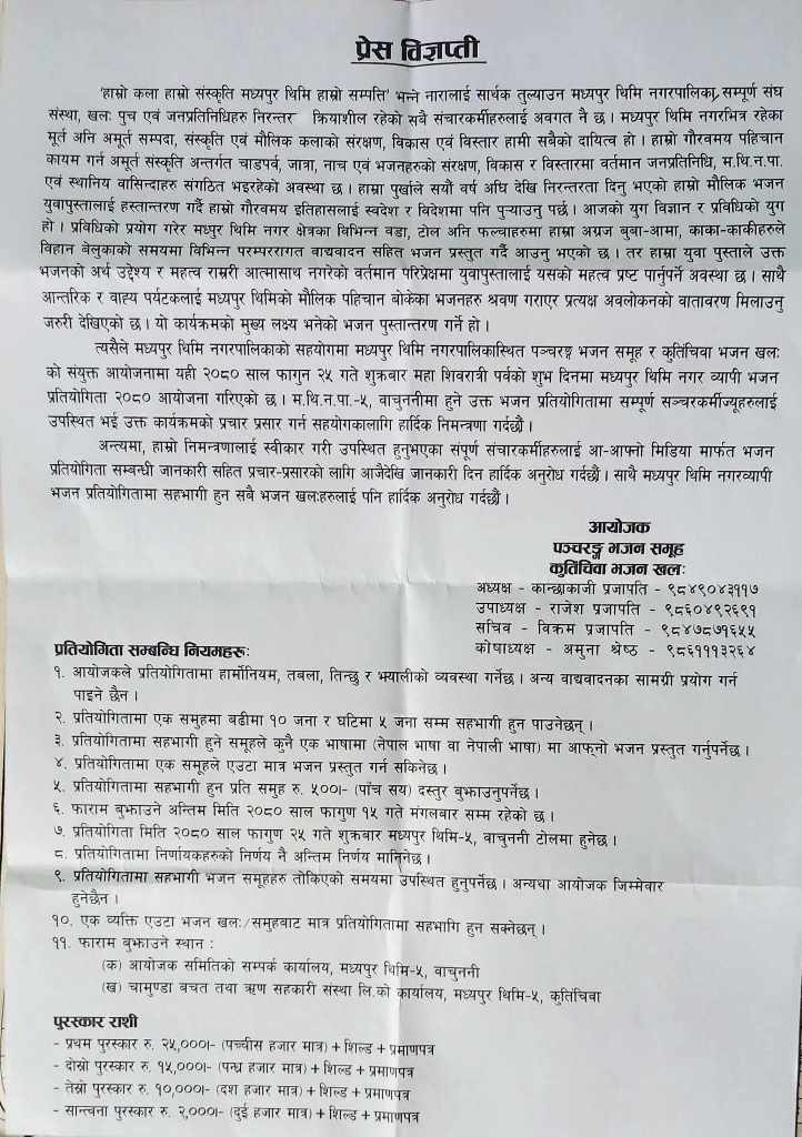 हाम्रो कला हाम्रो संस्कृति मध्यपुर थिमि हाम्रो सम्पति भन्ने नारालाई सार्थक तुल्याउन प्रथम मध्यपुर नगर व्यापी भजन प्रतियोगिता गर्न लागेको आयोजक समितिले जनाएको छ । परम्परागत भजनलाई युवा तथा नयाँ पुस्तामा हस्तान्तरण गर्ने उद्देश्यका साथ पञ्चरंग भजन समूह र कुतिंचिवा भजन खलको संयुक्त आयोजनामा मध्यपुर थिमि नगरपालिकाको सहयोगमा यही फागुन २५ गते शुक्रवार महाशिवरात्रीको पावन अवसरमा उक्त प्रतियोगिता हुन लागेको हो । उक्त प्रतियोगितामा प्रथम, द्वितीय, तृतिय र भजन खलःलाई क्रमशः २५ हजार, १५ हजार, १० हजार र सान्त्वना २ हजार नगद सहित शिल्ड र प्रमाणपत्र प्रदान गरिने आयोजक संस्थाका कोषाध्यक्ष अमुना श्रेष्ठले जानकारी दिनुभयो ।