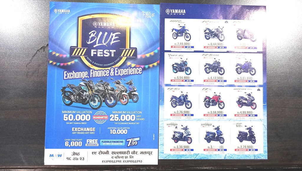भक्तपुरको सल्लाघारी चौरमा जेठ १८ गते आइतबारदेखि २३ गते शुक्रबारसम्म यामाहा एक्स्चेन्ज अफर चल्ने भएको छ । यामाहा मोटर साइकलको ब्लु फेस्ट अन्तर्गत सो एक्चेन्ज अफर सल्लाघारीस्थित ९९ रोपनीको खुला चौरमा चल्ने भएको हो । सो अफर प्रत्येक दिन विहान १० बजेदेखि साँझ ६ बजेसम्म चल्ने  आयोजकले जनाएको छ । आयोजकका अनुसार एक्स्चेन्जमा जुनसुकै ब्राण्डका पुराना मोटरसाइकल तथा स्कुटरहरु ल्याई नयाँ यामाहा ब्राण्डका विभिन्न मोडेलका नयाँ मोटरसाइकल, स्कुटीहरु लान सकिने व्यवस्था मिलाएको छ । जुनसुकै ब्राण्डका मोटरसाइकल तथा स्कुटीको न्युनतम मूल्य २५ हजार र यामाहाको भए न्युनतम ५० हजार (कर चुक्ता भएको) मूल्यमा साट्न सकिने व्यवस्था रहेको भक्तपुरका आधिकारिक विक्रेता द व्हीलस् प्रालिका व्यवस्थापक इन्जिनियर सुरेश कवांले जानकारी दिनुभयो । याहामाका आधिकारिक विक्रेता कवांले स्थानीयस्तरमा भक्तपुरमा हुन लागेको यो पहिलो एक्चेज अफर हो, यहाँबाट सहज तरिकाले फाइनान्सको सुविधामा पनि उपलब्ध गराउने जनाएको छ  । नयाँ खरिदमा न्युनतम ६ हजार छुटको व्यवस्था रहेको कम्पनीले जनाएको छ ।