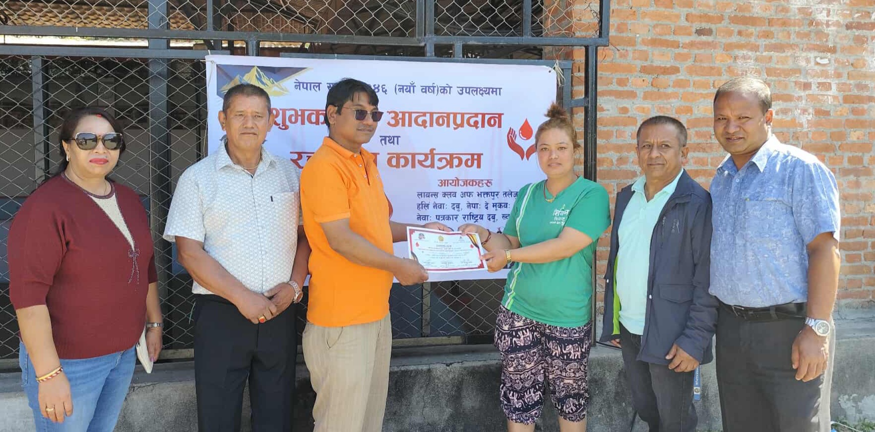 नेपालको मौलिक सम्वत नेपाल सम्वत ११४६ को उपलक्ष्यमा शुभकामना तथा रक्तदान सोमवार सम्पन्न भयो । लायन्स क्लब अफ भक्तपुर तलेजु, हलिं नेवा: दबू र नेवा: पत्रकार राष्ट्रिय दबू ख्वप कच्चाको संयुक्त आयोजनामा कमलविनायक गणेश मन्दिर परिसरमा भएको थियो । बिहान ८ बजे देखि करिव १०:३० बजेसम्म भएको कार्यक्रममा तिहारको ब्यस्तताले गर्दा सोचेजस्तो रक्तदाताहरू नभएता पनि कार्यक्रममा उत्साहजनक सहभागीता रहेको आयोकहरूले जनाएको छ ।