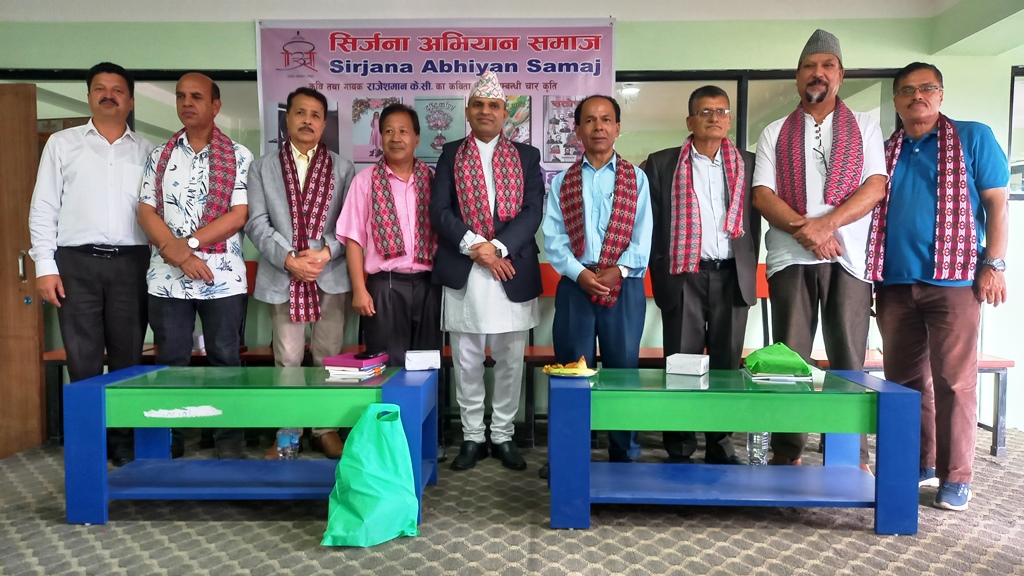 सिर्जना अभियान समाजको आयोजनामा शोमवार कवि तथा गायक राजेशमान के.सी.का कविता र लेखसम्वन्धि चार कृति एकै पटक बिमोचन गरिएको छ । बिमोचन कार्यक्रम नेपाल प्रज्ञा प्रतिस्थानका सदस्य सचिव जगत प्रसाद उपाध्यायको प्रमुख आतिथ्यमा भक्तपुर सल्लाघारी सिर्जना नगर स्थित मोर्डन कलेजमा भएको थियो । कार्यक्रममा बोल्दै प्रमुख अतिथि सदश्य सचिव उपाध्यायले एकै चोटी चार कृति बिमोचन गरेकोमा कवि तथा गायक केसीलाई बढाई दिनु भयो । उहाँले लेख रचनामा मन छुने गहकिलो शब्दहरु प्रयोग गरि लेख्न सके अझ राम्रो हुने पनि बताउँनुभयो ।