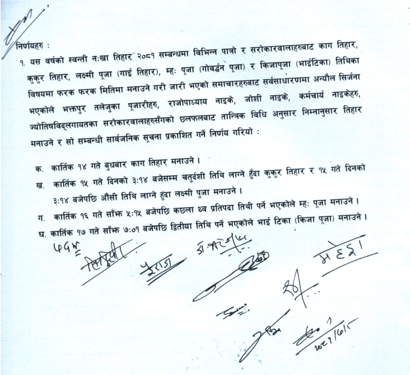 बैठकले २०८१ कार्तिक १४ गते बुधबार काग तिहार मनाउने, कार्तिक १५ गते दिनको ३ः१४ बजेसम्म चतुर्दशी तिथि लाग्ने हु“दा कुकुर तिहार र १५ गते दिनको ३ः१४ बजेपछि औंसी तिथि लाग्ने हुंदा लक्ष्मी पुजा मनाउने, कार्तिक १६ गते साँझ ५ः१५ बजेपछि कछलाथ्व प्रतिपदा तिथि पर्ने भएकोले म्हःपूजा मनाउने, कार्तिक १७ गते साँझ ७ः०१ बजेपछि द्वितीया तिथि पर्ने भएकोले (भाई टिका) किजा पूजा मनाउने निर्णय गरेको छ ।